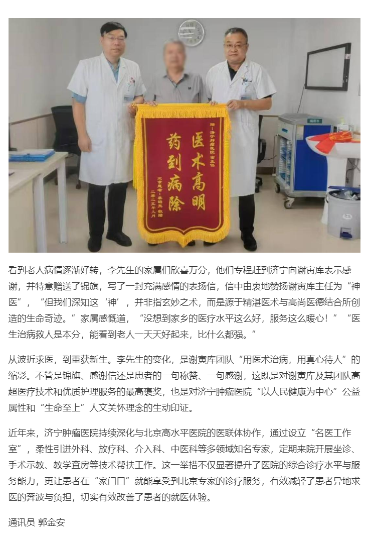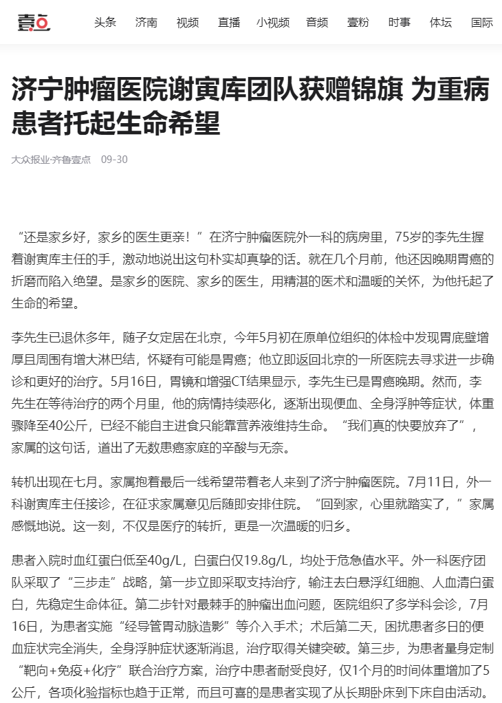 《齐鲁晚报·齐鲁壹点》| 济宁肿瘤医院谢寅库团队获赠锦旗 为重病患者托起生命希望